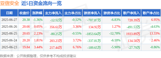 本站消息,截至2025年6月27日收盘,亚信安全(688225)报收于20.38元,下跌1.36%,换手率2.4%永旺配资,成交量5.02万手,成交额1.04亿元。