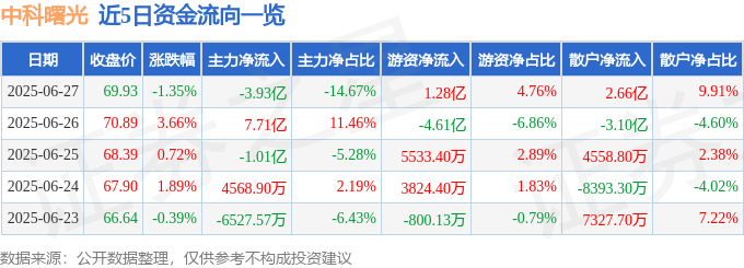 6月27日的资金流向数据方面,主力资金净流出3.93亿元,占总成交额14.67%,游资资金净流入1.28亿元,占总成交额4.76%,散户资金净流入2.66亿元,占总成交额9.91%。